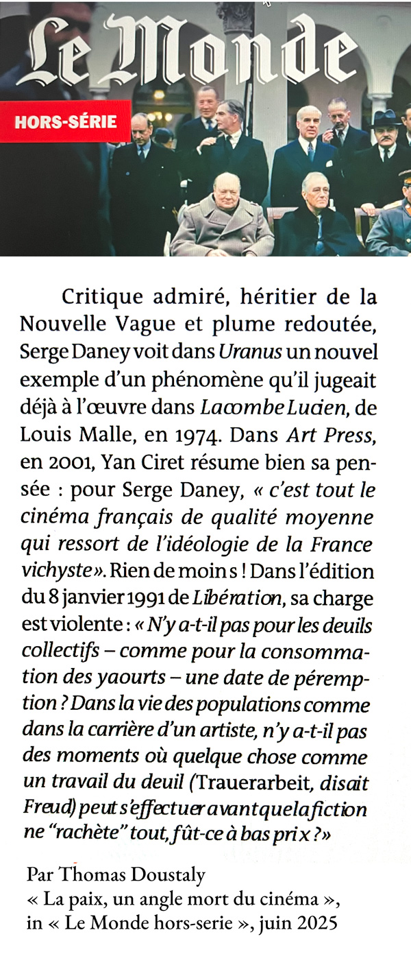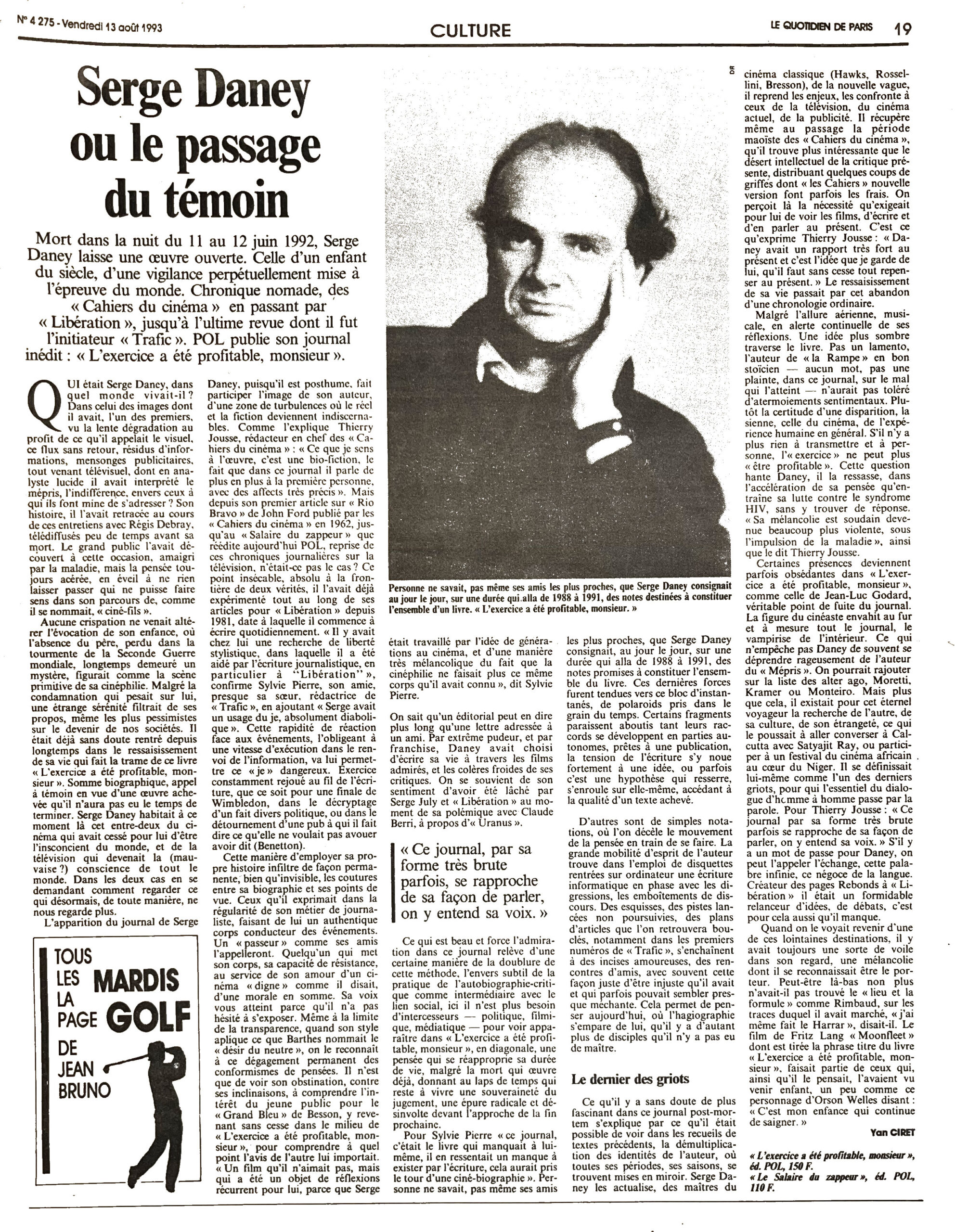 Serge Daney ou le passage du Témoin, Yan Ciret (Le Monde, Culture, 13 août 1993)